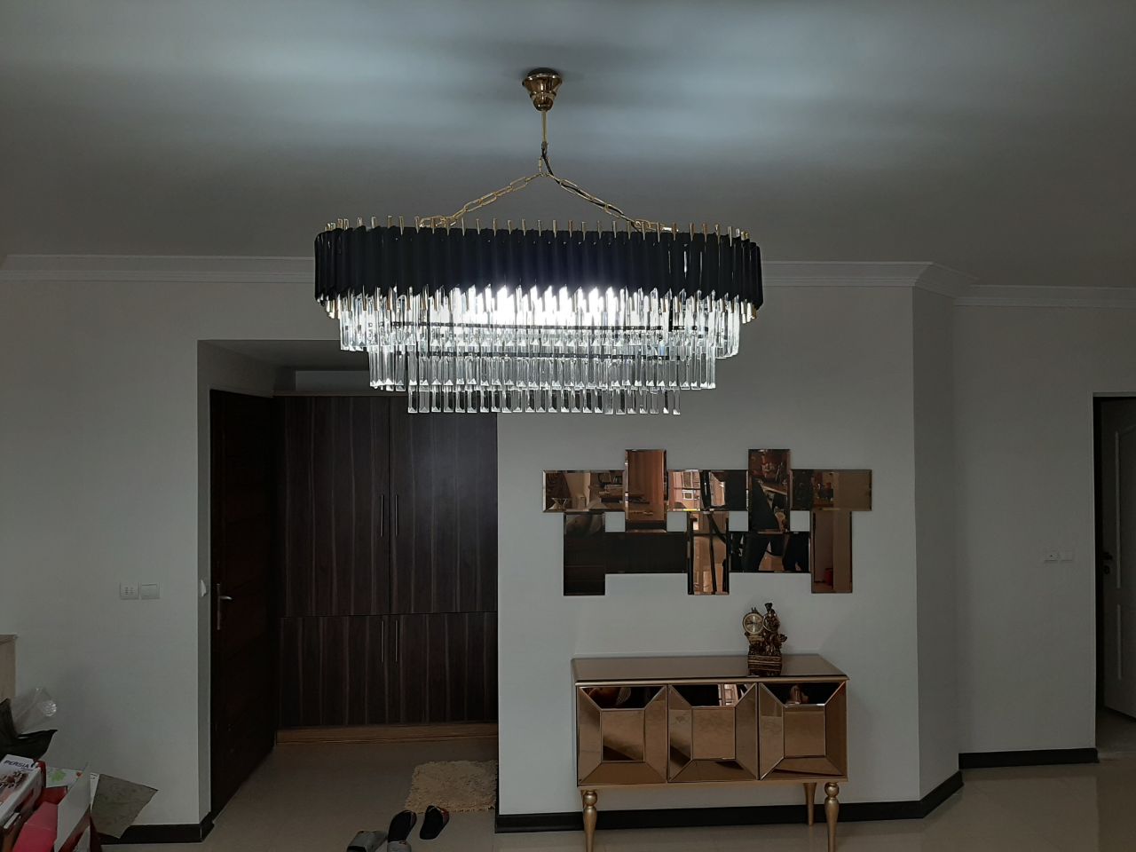 The use of painted and plated metal pipe in the construction of the body and triangular crystal, the ability to adjust the height from the ceiling, the use of candle lamp (E14), can be ordered in gold and black gold colors, suitable for living room, bedroom.